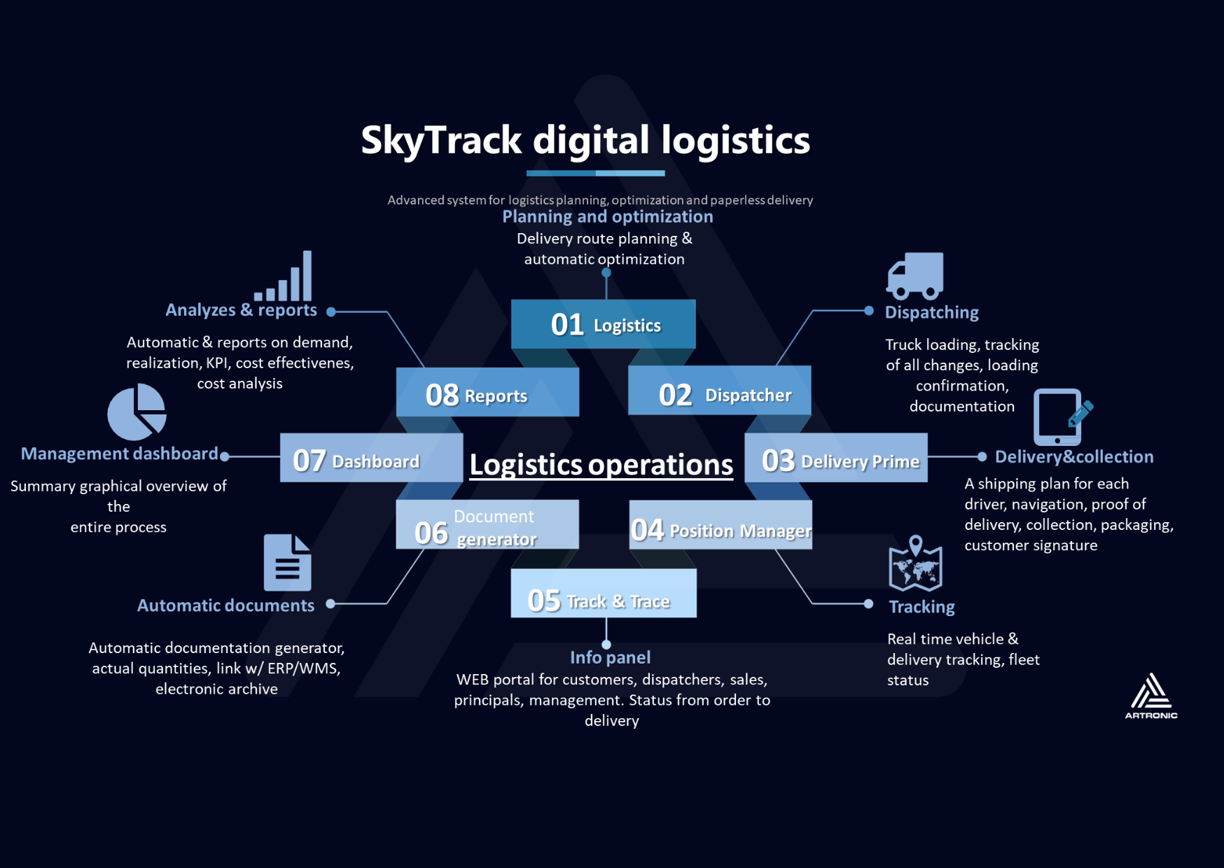 As one of the most prestigious and prominent solutions in the logistics world, SkyTrack digital logistics system stands out, a specific modular solution with which companies improve the functionality of their fleet, reduce costs, increase productivity, save time and resources, contribute to environmental protection and have the possibility of transparent business. System is used via tablets.